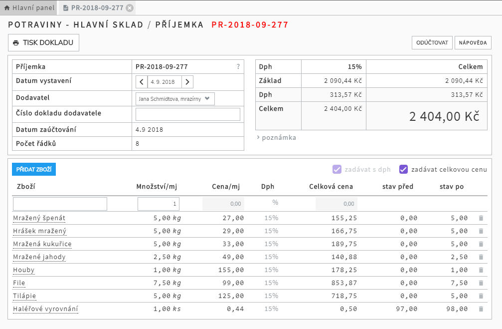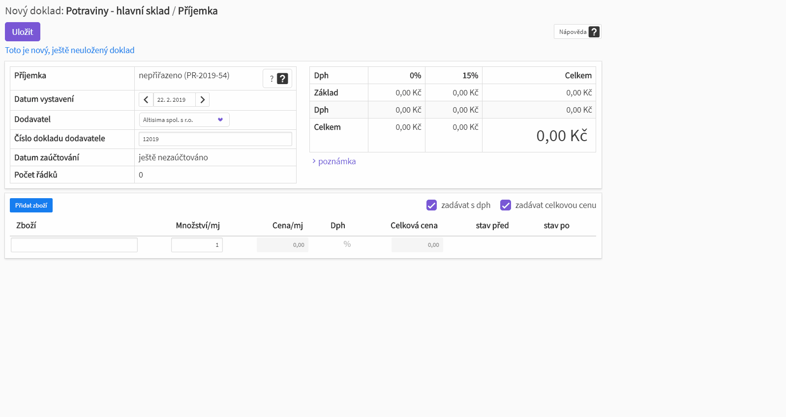 Dále zadáváte položky. U příjemky vyhledáte název zboží a zadáte přijímané zmnožství a jeho cenu. Po zadání všech položek doklad uložíte.