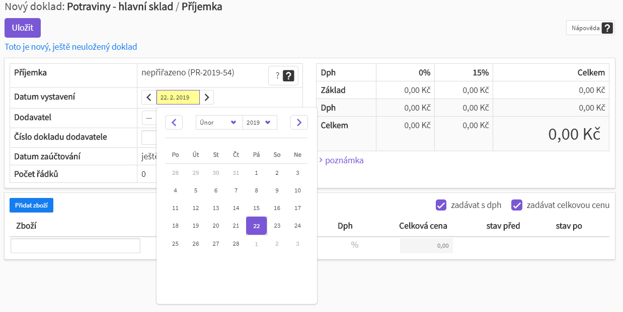 Nejprve určíte datum posunem na šipkách prostřednictvím kalendáře, který vyvoláte klepnutím myši do pole s datumem. U příjemky zvolte skutečné datum příjmu zboží, u výdejek datum výdeje.