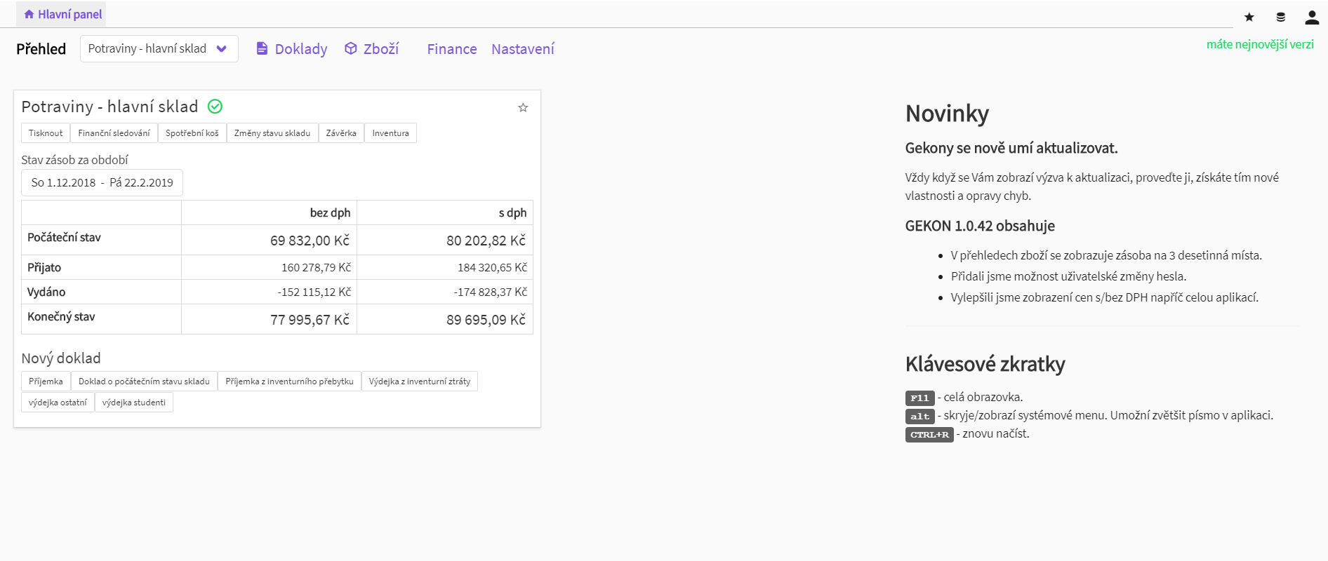Hlavní panel je základní obrazovka programu GEKON. Přehledně zde vidíte zobrazeny informace o vašich skladech, můžete zakládat doklady, ovládat hlavní menu programu a funkce, které se vztahují k jednotlivým skladům.