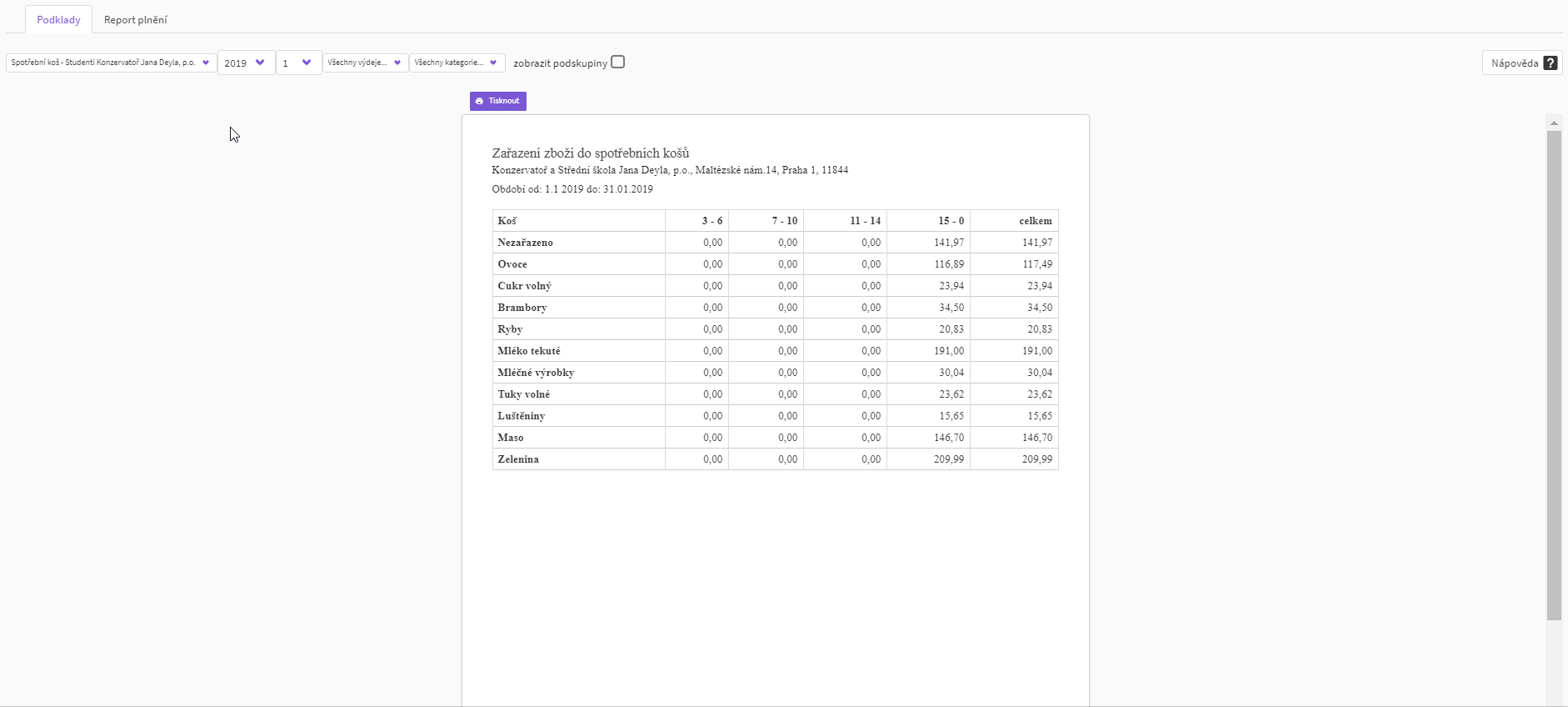 Obvyklý report, který zobrazí plnění Spotřebního koše za daný měsíc. Norma je vždy podle přihlášených strávníků za celý měsíc.