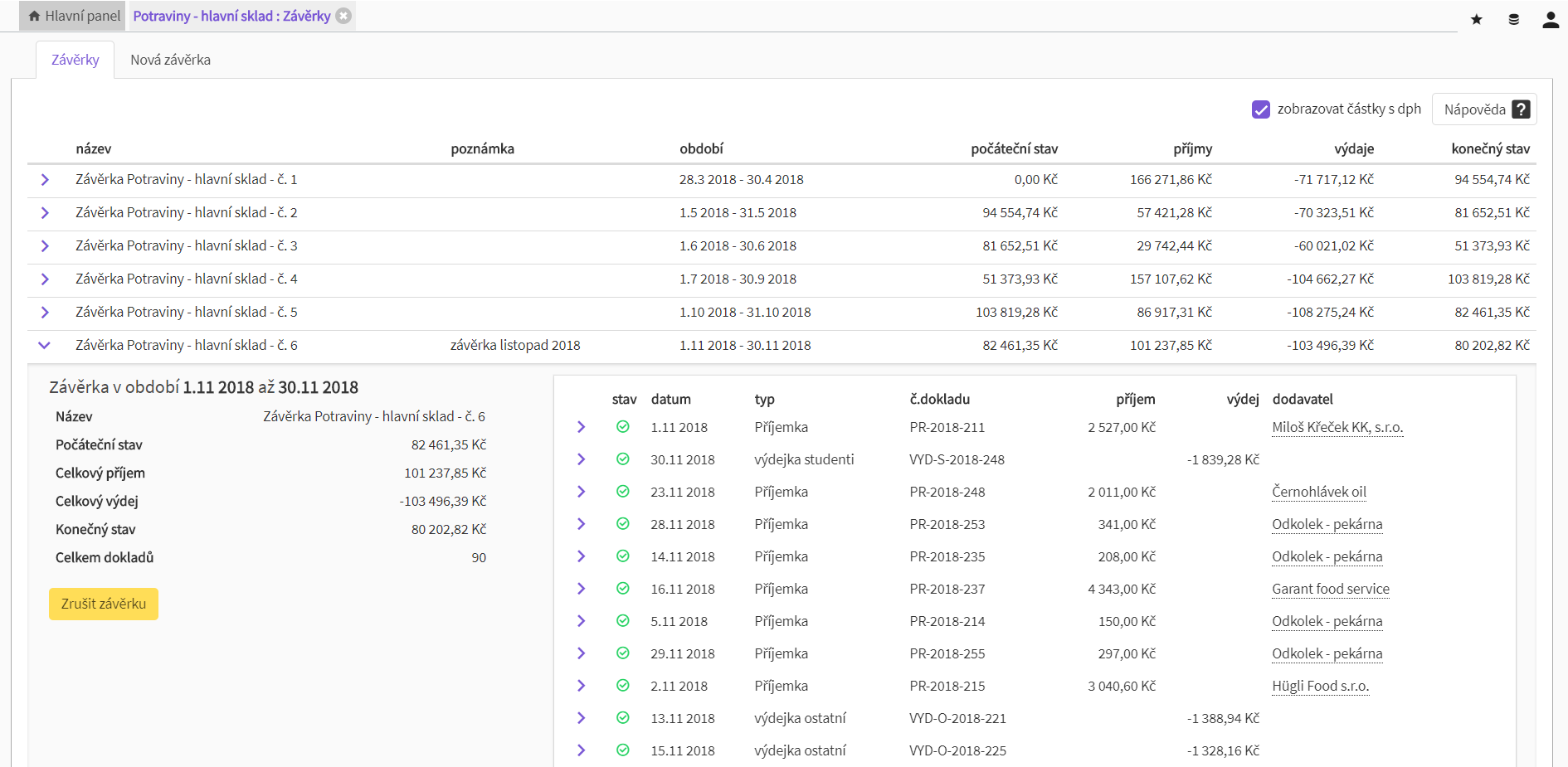 Po volbě tlačítka závěrka se vám zobrazí přehled všech vytvořených závěrek. Závěrky v Gekonu lze kdykoli zrušit. Rušení závěrky je dostupné od poslední provedené závěrky.
