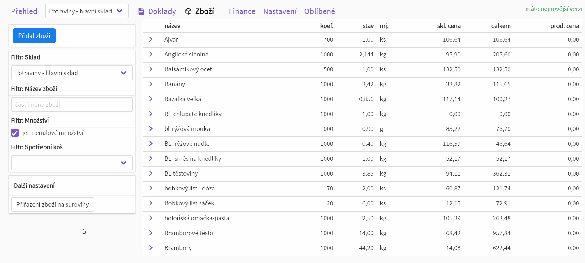 Pro zajištění správné funkce je nutné položky zboží z vašeho skladu navázat na tyto suroviny. Vytvořili jsme pro to inteligentní nástroj, který vyhodnocuje shodu názvu a podle ní navrhuje přiřazení.