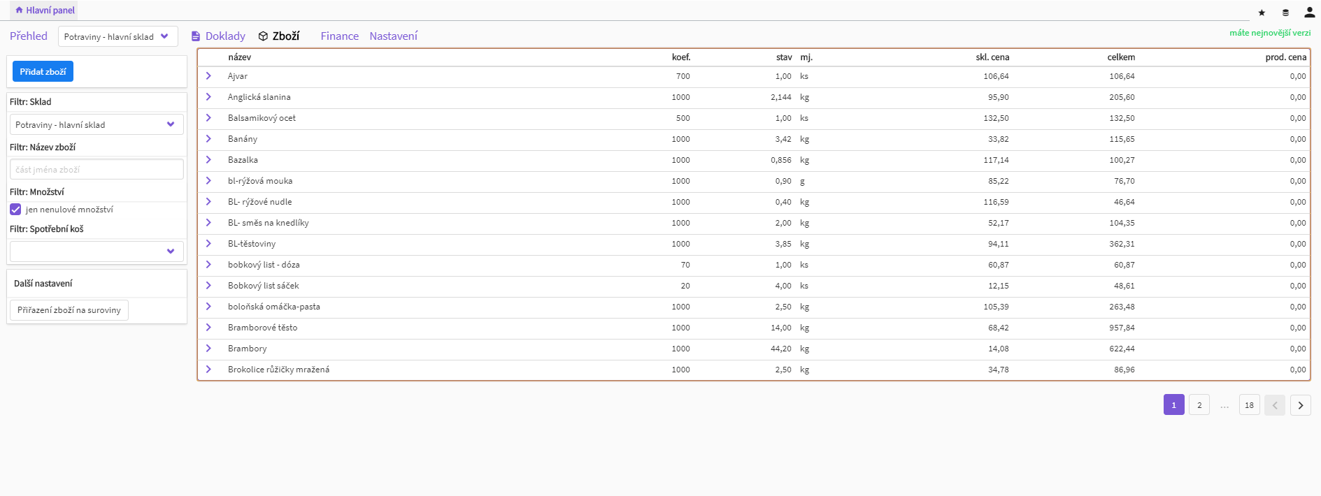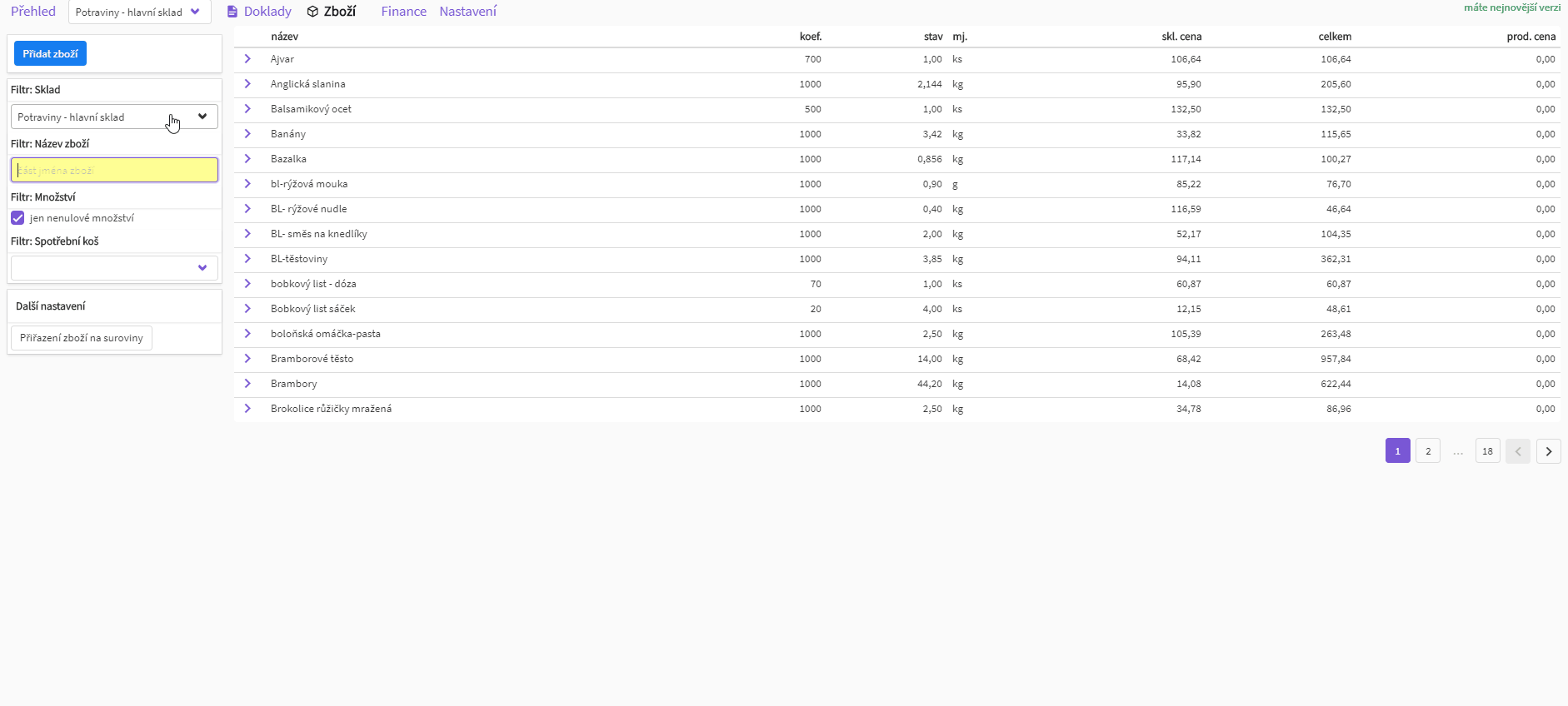 Obrazovka Zboží umožňuje zobrazit přehled zboží, editovat jednotlivé záznamy a filtrovat. V levém horním rohu je tlačítko pro přidání nového zboží.